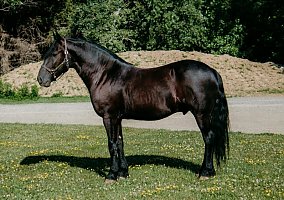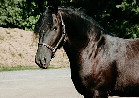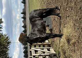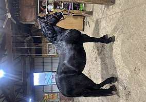 Onyx also known as Blackhawk is a 6-year-old registered Friesian/Pony gelding standing at 14.1hh. Well, broke to ride and drive. Rides both English and Western. Amazing arena horse! Lopes a circle nicely. Picks up walk, trot, and canter easily. Leg yields. Does great on obstacle courses.. Stands quietly and patiently at a mounting block. Stops and stands when asked. Picks up both leads correctly. Blackhawk would be a nice dressage prospect. Blackhawk has also been used on the farm. He has been on trails and will cross creeks, step over logs with ease, and climb any hill you ask him to. He does fine out in groups or out alone. He is traffic safe and will stand patiently while at stop signs. This pretty gelding also has excellent ground manners and has the sweetest personality. He is easy to catch in the stall and outside. Ties nicely on a lead line and in cross ties. He is easy to handle, even the kids can groom, tack, and get him ready to ride with no help from an adult. He stands well for the farrier and vet. Blackhawk loads well and remains quiet during hauling. He has a super sweet attitude and loves attention! Blackhawk sells a 100% sound with x-rays and PPE! Contact Cindy at 716-200-2937 for more information! Located in Akron,NY