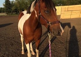 Bling Bling is a STUNNING 2003 dual registered part-bred pinto Arabian/Saddlebred mare with champion bloodlines and lots of personality. Standing at 15.1hh, she has three lovely working gaits and is responsive to your seat and legs while maintaining a soft mouth. She has been training as a working hunter/english pleasure show horse with an adult amateur for the past two years. Bold and forward on the trail, she has stamina for days.