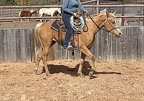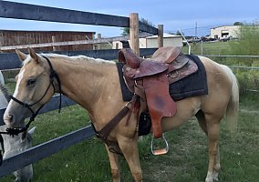 Wimberly 6yr old 14.3 AWHA registered palomino mare. She is super gentle and personable. Will follow you around once attached and comes when you call her. Good with farrier. No spook, can do anything on her. Raised by us since she was a goal so is very gentle and used to all kinds of people and different animals. Professionally trained and ridden on trails and through obstacle courses. Great bloodlines and can be taken in any direction from ranch work to competition. Will only sell buyers who will provide a good environment and only selling due to our health issues.
