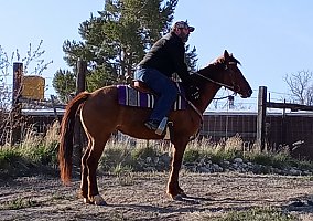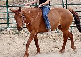 Maverick is a one of kind personality, "little engine that can." She is titled as a sorrel but is a gorgeous peachy red dun color with dorsal strip. I got her for my daughter, from a friend of mine that is an excellent balanced horsewoman and trainer. Maverick was her first competeition mustang, Mustang Mania 2021, she took 8th place in hand freestyle. She is very smooth under saddle walk, trot, lope. I am selling her as green broke, but she is ready to be finished in any equitation direction. Never offered to buck or rear. She loves the domestic life and that has possed a bit of an issue with us since we are planning to move to Alaska and do not visit the arena. We are more mountains and trails ruff country people, pack out elk and deer. She needs to be a show girl and she has the heart in spades for it.We have found being her second people ever that she LOVES children and she is plenty stong enough to lope circle with a average sized adult. She is great in arenas and round corrals, trails are fine with groups. But out in the open riding solo she goes into survival mode and is very watchy hates plastic, and my twohorse strait load trailer, the hay tarp is okay but please dont try to make her wear it.She will load herself into a slant or stock trailer Because of this we have not tried to put a pack saddle or any animal hides on her. We have mainly rode her in the round pen and had her all over the back of our property. My daughter is an advanced beginner and I have done lessons with her and Mav. Maverick has a knack for it and would make a great lesson horse. When I have ridden her she is very responsive, I think she would do great in gymkanna, western, bareback, and english equitations. She is a boss mare and preffers not sharing her hay, at the trainers she got along with the other 2 horses and mothered the pony she was with. She is great with the farrier, and vet(never had shoes, vey healthy feet, utd on all vaccines, and current on coggins no health issues). I really want her to got to a intermediate/advanced or be used in lesson programs the right home I will negotiate on price. This mare has potential and great mind, but I need a simple trail horse my daughter.