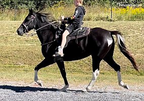 Dibs is a four-year-old racking mare born on March 25th, 2018. She is 14.2 hands and is a beautiful black and white filly. She is registered SHOBA and can do the four-beat rack up to 15 mph if you ask for it. She does the perfect four-beat gait and is smooth as silk naturally and even with a loose rein. In the video, dibs was put under the saddle by an 11-year-old girl who is riding, standing on, and turning flips off Dibs. She has been a family favorite since she was purchased as a 6-month-old. The youngest grandson, which is also in the videos, got his start on Dibs. The reason for selling is simple. You can’t keep them all, and the grandchildren continue working with other horses. There is absolutely nothing wrong with this little girl. Our only desire is that she gets a home that will love her and enjoy her as we have.