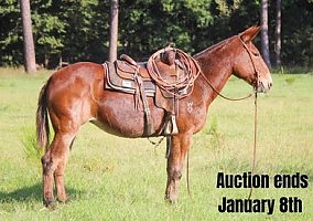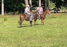 Pat is a 10 year old molly mule standing 15.1. Pat has been used outside penning and doctoring cattle a lot, as well as in the cutting pen. Pat has been coon and hog hunted off of. She stands to be shot off of and is absolutely gentle for anyone. Pat has packed in the mountains, and has been rode many miles on the trails. Pat is very broke - she has a nice one hand neck rein, pivots very nicely, good stop and is very easy to ride. She saddles, bridles, leads, loads, hauls and ties good. She is very gentle, not spooked at all, has been rode by all ages and levels of riders and is absolutely safe for anyone! Pat is a true one of a kind mule that is broke for anyone and can do any job! Located in Rusk, TX. Call Rachel Kruger with any questions 605-370-4644.