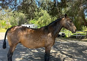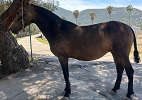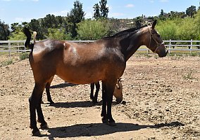 COMMENTS: Mare and foal. Spanish-type, fantastic bloodlines, good forward movement, calm, pleasant friendly broodmare, kind with other mares and babies, good producer, cross ties, she stands for farrier and loads. Not under saddle. One to watch. Bred June 7 2024 to Apoteo PM a spectacular perlino imported from Spain. 05/11/2025 Bay filly at her side. She has since been re-bred to the same sire Apoteo PM. Shipping can be arranged!