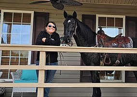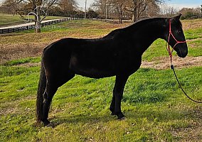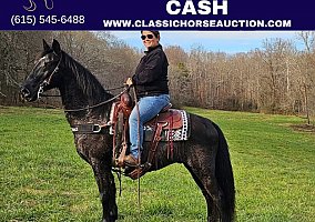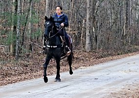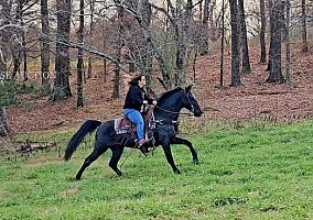Cash is a gorgeous jet-black gelding with all the looks, brains, and ride, he is gentle, well-trained, and has the sweetest disposition! He is personable and playful, and he loves people! His gait is one of the smoothest, most natural 4 beat gaits we have ever seen or ridden, he is the kind that you can ride for miles and miles very comfortably in his gait. Cash has been a family horse for us, we have all enjoyed our turns riding him, from riding around the neighborhood to all sorts of trails, Cash has been there for it all. There is much to say about Cash’s gait and its smoothness. When owning a gaited horse, the smoothness and natural travel of the gait is very important. Cash has that from a walk all the way up to 10 mph gait. He is smooth and natural from start to finish and everywhere in between, you can’t make this guy trot! He requires no special shoeing to achieve this gait as it is all natural. On top of this all he will be your best hang out by the porch buddy, the kind you even may bring in the house for a cup of coffee! Cash stands to mount, loves attention, gets along with all his pasture/stall mates, stands for the farrier, loves to be groomed! If you are looking to start your new year with all the looks and smoothness of the trails, you’ll not want to miss out on this guy!