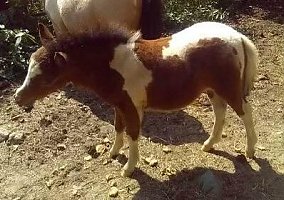 Flashy rich red pinto with black mane and tail. Sire is Mr. Majesty of Cedar Valley. He is a double registered 31" few spot sorrel appaloosa and is a grand son of of national championship breeding. Mom is a buckskin pinto with black mane and tail. He is friendly and will mature about 31". Ice blue eyes