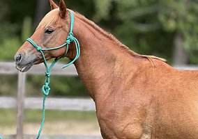 Rocker is a good-looking red sorrel with a flaxen mane and forelock, a cute little head, a sweet face with a kind eye, a nice wither, a straight back, with a wide chest and hip, and a long thick tail.