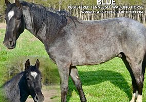 Introducing Allens Roan Lights McCurdy, affectionately known as Blue a registered 3-year-old Blue Roan Tennessee Walking Horse gelding. He stands a solid 14.3 hands tall! Blue is an exceptional gelding with an outstanding personality. He’s easily the barn favorite thanks to his impeccable manners and smooth, enjoyable ride. While his charm and temperament shine in the barn, he’s an absolute joy out on the trails. Blue is a true trail horse deluxe. He’s been exposed to a wide variety of environments, including field trials, camping trips, long trail rides, and beginner riders. Whether you’re riding alone or with a group, Blue stands out with his steady, confident demeanor. He handles new experiences with ease and grace, making him a dream horse for trail riders. He confidently navigates steep hills, rough terrain, water crossings, and ditches like a seasoned pro. He’s patient, willing, and surefooted the kind of horse you can trust no matter the conditions. Blue also stands quietly for the farrier, clipping, and bathing, and he loads and backs out of the trailer with ease. You won’t find another gelding quite like him. Don’t miss your chance to own Blue!