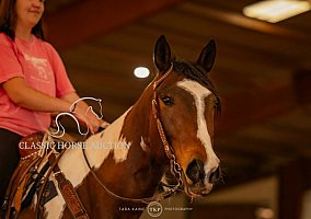 Meet Echo, a 6-year-old bay tobiano gelding, standing at 15.2 hands and dual registered with both the APHA and the Pinto Horse Association. This eye-catching, well-mannered gelding is the total package. Versatile, willing, and ready for his next adventure. Highlights: • Current on Coggins and vaccines • Loads, leads, ties, stalls, stands for the farrier, travels well, and stays behind hotwire • Shown in halter, showmanship, and pleasure. He knows how to shine in the ring • Trail ridden with confidence and ease • Used for light ranch work and drill team practice • Comfortable around livestock and poultry. Nothing rattles him • Rides out alone or with a group • Handles obstacles with a calm, can-do attitude • Bottom of the pecking order in a mixed herd. Easy to get along with • And best of all: He catches YOU! Echo is a well-rounded, sweet-natured gelding who’s just as happy taking it easy on the trail as he is getting dolled up for the show pen. With his solid foundation and quiet disposition, he’s ready to be someone’s go-to horse for just about anything.