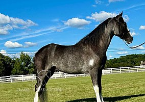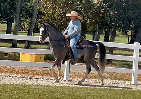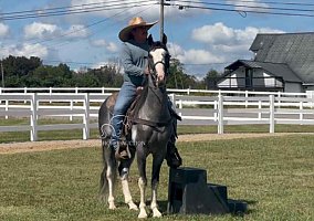 Rock around the barn with style! Meet I WANNA ROCK “Rock”, a 3-year-old, 14.2 hand registered Tennessee Walking Horse gelding with a unique grey sabino coat and striking, eye-catching markings. This stout young gelding is built just right for the trail and already shows plenty of promise. Rock steps right over to the mounting block, crosses water, logs, and mud with no problems, and loads and backs off a trailer with ease. Around the farm, he’s been exposed to dogs, fun-loving kids, ATVs, and large equipment. None of it bothers him. He shines in his ground manners, standing perfectly for saddling and unsaddling, grooming, shoeing, and taking the bit. Smart and willing, Rock is quick to learn and eager to please, making him a fun and rewarding partner to bring along. With more time under saddle, Rock is sure to make a fine trail horse. Between his size, brains, and bold color, this young gelding is the total package for someone looking for a sharp and talented prospect.