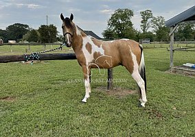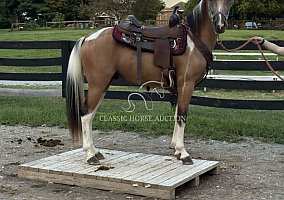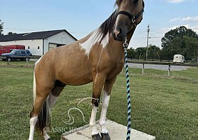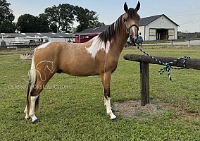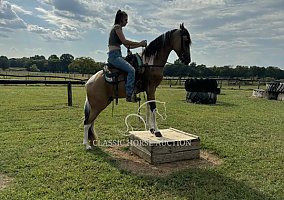 McClintock Midnight Whiskey is a stunning 15-hand, 2-year-old Spotted Saddle Horse gelding born on May 16, 2023. This gaited horse is as sweet and personable as they come—he’s truly an “in your pocket” type with a willing heart and a smart, calm mind. His buckskin coloring adds to his striking appearance. Sired by a multi-time World Champion double-registered Racking Horse, and out of a mare by Alen’s Johnny Reb—a son of the legendary Spotted Alen Again—this colt has elite bloodlines that show in both his talent and temperament. McClintock Midnight Whiskey has had an exceptional start in life. He loads, leads, lunges, bathes, clips, stands to mount, and backs up easily. He’s been exposed to trail obstacles, is confident on trail rides, and has even seen the inside of a big show ring, handling it all with maturity beyond his years. The perfect trail horse. He’s soft, responsive, and naturally gaited, with smooth, fluid movement that’s sure to stand out whether you’re on the trail or in the ring. With his foundation already laid. This Spotted Saddle Horse colt is ready to continue in any direction—show, trail, or pleasure—and will only get better with time. I truly can’t say enough good things about this young gaited horse. He’s the kind that’s hard to find, and even harder to let go. With his whole life ahead of him, McClintock Midnight Whiskey is a rare opportunity to own a well-bred, well-started, and endlessly promising Spotted Saddle Horse gelding, perfect for any trail horse enthusiast.