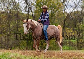 While on the trail, you can drop the reins on Strawberry, and he will hold a nice, slow, steady walk in which you can ride with non-gaited horses. He will also consistently walk faster if you cue him to do so (just by lightly squeezing your legs once). He has a lovely, even foxtrot and a lope (canter) that is a dream to ride! Strawberry neck reins, side passes both directions, and has a nice, steady back-up.