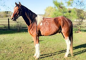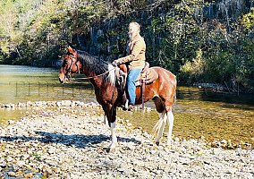 Chip is a stunning 4-year-old registered Missouri Fox Trotter gelding with a beautiful bay-and-white coat. Standing at a solid 15 hands, he has the size and build to be a comfortable mount for any rider. Don’t let his age fool you; Chip has been extensively trail-riden and camped all over, handling diverse terrain and situations with a maturity beyond his years.