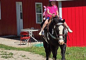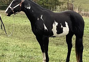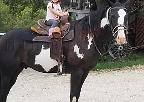 He is laid back, handles well on the ground, willing to please, and is a good hand on the farm. You can pony him with beginner riders or pony other horses with him. He has helped break our Colts to lead. He rides well on trails and has a calming effect on young or new horses.