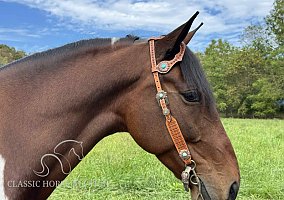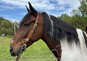 Scout is a handsome 6-year-old grade Spotted Saddle Horse gelding standing 15 hands with a nice stocky build. This is a been-there-done-that gelding raised in Eastern KY and hauled to many other state parks on riding trips. This is a smart horse with a willing attitude and an eager-to-please mindset. Scout is super-gaited and exceptionally smooth. He is sure-footed and self-confident on the trail. He will lead, follow, and ride out alone with no issues. Scout is the kind of horse you can enjoy every day and not have to worry about what mood he is in.