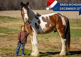 Add a little color to your barn with this one-of-a-kind gelding who brings quiet confidence to every ride! He’s personable and gentle, with that laidback, husband safe attitude everyone wants, but rarely finds. On the trail he’s calm, steady, and sure of himself, whether you’re out for a quick loop or heading off on an overnight camping trip. Safe for guests and dependable enough to help with ranch chores, he’s a trustworthy partner with the feel of an old soul. Clayton is a 3-yr old, bay paint, Gypsy Drum gelding, currently standing 15.3 hands, & he’s ready for his next best friend! Clayton has spent this past summer with us logging miles of trails, working on a cattle operation, and serving as the “go to” when my teenagers organize a weekend camping trip with their non horsey friends. He’s the one we load up every time when we need a steady mount for someone who doesn’t have a horse to ride. Clayton has been trusted to come along on numerous trails across various states. He ties on a line overnight, is always quiet, and provides the same safe experience every time. Clayton crosses water, goes up and down inclines, navigates rough terrain & downfall with ease. A more whoa than go style. Clayton is an asset on the farm. We use him to gather cattle alongside working stock dogs, to rope & doctor calves. There’s nothing he isn’t willing to try, a true working partner. Clayton is young, but wise beyond his years. He is gun safe, traffic safe, carries the flag, and is unbothered by the tarp. We’ve rode up on various wildlife including deer & turkey, and he just carried on. His daily life includes working alongside ATV/UTV’s, large farm equipment, and other livestock, I’m convinced there’s nothing he hasn’t seen. Whether you’re searching for a safe and steady trail horse, a dependable ranch partner, or simply an enjoyable ride right at home, Clayton is your guy. He’s the kind you can count on every time you swing a leg over. If you would like to meet Clayton or have any other questions prior to adding him to your family, feel free to reach out! PPE’s welcome! We can assist in arranging shipping to anywhere!