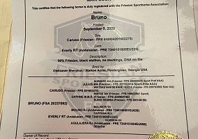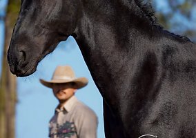 Bruno is a two-year-old Friesian Sport Horse. He is 50% Friesian (sire) and 50% PRE Andalusian (dam). He currently stands just over 16 hands, and I expect him to mature to around 16.1 hands. He was foaled on our farm, and I have had the pleasure of being involved in the training of both parents. Bruno has awesome ground manners. He still has some baby personality traits and a few immature physical features, but he is slowly growing into a big boy. He leads super easily with no fighting or negative behavior. He loads just fine and is easy to catch. He still has a baby personality, meaning he loves to cuddle and be petted, but he is slowly starting to mature and be a little too “cool” for that. To say the least, Bruno’s training has been a blast and a breeze. He is an A+ student with a silly side. He learns new skills very quickly and safely. He does not get emotional or lash out when confused. He has never sat back and does great with showers. Bruno is super fun and watching him develop has been a real pleasure. He is started under saddle but only with direct rein and short riding sessions due to his young bones. Bruno is light on his feet and a true head-turner when he frames up. He has a very light trot and canter, meaning he does not bounce you around with every step. Bruno is mostly ridden in a bosal due to my training program, but he can and has been ridden in a D-ring snaffle bridle setup with a noseband. Bruno is best under saddle in the round pen and show arena. He has light exposure to trail rides and traffic. Our farm is constantly active, so he has plenty of exposure to loud noises, animals, and children. He travels well and is comfortable around other horses.