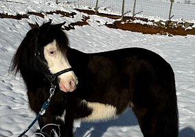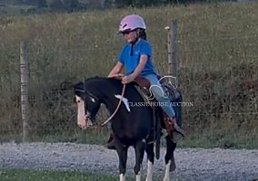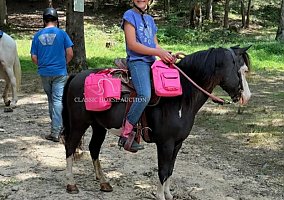 GFrank is a beautiful black and white, stout little pony with a flashy bald face, four white stockings, a white belly, and two bright blue eyes that stop you in your tracks. He’s the perfect step-up pony for the kid who wants to keep up with the big horses but isn’t quite ready for one yet. Frank handles wonderfully, rides quietly, and drives like a dream, making him extra special and versatile. He’s been exposed to all kinds of kid shenanigans and takes everything in stride, always taking care of his little girl. Safe, patient, and kind, Frank is the type of pony that builds confidence and creates memories that last a lifetime.