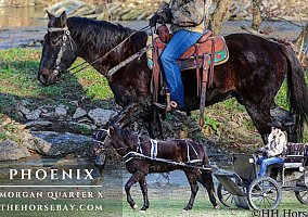 This is “PHOENIX”, a spectacular, seasoned, solid, and experienced DARK BAY MORGAN QUARTER HORSE CROSSBRED GELDING that is broke to ride and drive. He stands 15.2 hands tall and is 5 years old. This nice gelding is quiet, safe, honest, predictable, and dependable. He has been used for packing wild game out of the mountains on hunting excursions, he has been driven through the cross-country driving courses, been shown in the hitch classes, driven to town, ridden English and Western in and out of the arena, and he has been trail ridden in all sorts of terrains. He has been in the steep mountains, through the deep waters, through the rocky stream beds, and he has been in the pastures to check cattle. He is sure-footed and knows how to hold back when going down steep hills. This gelding aims to please; he will go anywhere you point him under saddle or harness, and it won’t get too deep or too steep for him. He is confident, rides alone bravely, and performs well in a group. He doesn’t mind leading the pack or bringing up the rear. He is constant, steady, and true. This gelding will ride relaxed on a loose rein and will not go any faster than you ask of him. He drives for novice and beginner teamsters. Schoolchildren have driven him to school without issues. He is easy to stop, turn, and maneuver in tight spots. He stands tied quietly; he stands to harness, hitch, tack, mount, and groom. This gelding is accustomed to children running around the barn; he is fine with dogs trailing his heels, and he is relaxed and calm in new, unfamiliar situations. He is the type of horse that loves attention and stays quiet even when his surroundings become chaotic. He has been ridden and driven on the moonlight rides. He is a versatile, docile, well-rounded young gelding with extensive experience and remains gentle. He genuinely loves people and has a pleasant personality. He gets along well with other horses. He stands for a bath, loads and unloads quietly, and has excellent ground manners. View his video and contact Erin with any questions.
