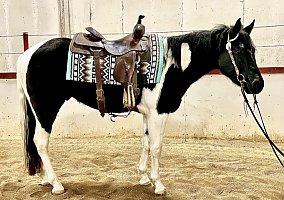 Doc is a 2 year old APHA black & white tobiano gelding that stands 15 hands tall and would make the perfect ranch horse. Make this horse your Christmas present for the upcoming year moving cows, in the branding pen or coving miles checking pasture, Doc is smooth, soft and stylish!