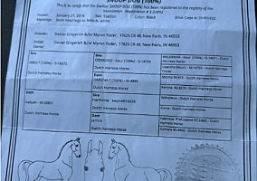 Snoop Dog is DNA verified and registered with the American Dutch Harness Horse Association, backed by a documented, proven pedigree featuring respected Dutch Harness bloodlines on both the sire and dam sides.