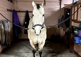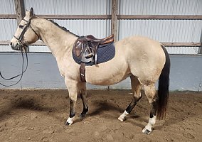 15.1hh 14 year old buckskin quarter horse mare. Goes English or Western. Was purchased to be a lesson horse in our program. We teach English riding and found the she much prefers a western saddle to an English saddle.