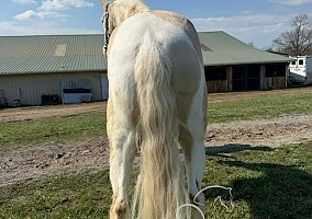 GERONIMO’S SPOTTED GOLD is a stunning cremello Tennessee Walking Horse gelding standing 15.2 HH and registered. With his unique color, spotted markings, and natural presence, he is the kind that turns heads everywhere he goes. This gelding is extremely versatile and well broke. He is broke to ride and drive, both single and double, and handles each job with confidence. He has been field trialed, shown, and trail ridden, giving him the kind of experience that makes him dependable in many different settings. Gold is broke to shoot off of and remains calm while bullwhips are cracked around him. He will lay down on cue and play with a soccer ball, showing off his quiet mind and willing attitude. He stands quietly for mounting and dismounting and is easy to handle in all situations. Out on the trail, he is steady and confident. He crosses mud, logs, and creeks without hesitation and will go wherever you point him. He has had kids show him and trail ride him, proving his gentle and dependable nature. If you are looking for a broke, flashy, and versatile gelding that can do it all, GERONIMO’S SPOTTED GOLD is one you will not want to miss. Come see him for yourself, ride him, drive him, and experience everything he has to ** Both horses have achieved Top Honors Flat Shod status in the Walking Horse Report Top Ten list for multiple consecutive years, with Gold earning back-to-back wins. **