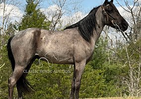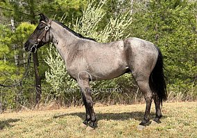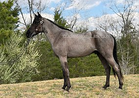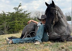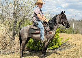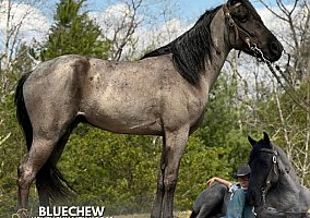 Here is what dreams are made of… a once-in-a-lifetime, beautiful blue roan gelding standing around 14.1 hh. Four-year-old BlueChew is the perfect trail companion. He will ride on a loose rein, and if you ask him to step up, he will gladly do so. BlueChew is super smooth gaited in that classic four-beat gait, along with a nice canter and the amazing cowboy color everyone wants. He has been trail ridden throughout Missouri, Alabama, Mississippi, Tennessee, and the great state of Kentucky. He handles steep slopes, crosses water, logs, big rocks, and anything else you decide to put in front of him, including mud and ditches. BlueChew will ride in the front, back, or middle, alone or in big or small groups. He is that unicorn everyone is looking for. He is easy to ride, and anyone will love him. He is easy to clip, bathe, tack up, load, shoe, and handle in every way. BlueChew has been exposed to all kinds of wildlife such as deer and turkey, as well as livestock like cows and dogs. He has been ridden on busy highways and is traffic safe. He is up to date on Coggins, health certificate, and vet exam. His teeth have been floated, and his wolf teeth have been removed. He has been vaccinated with Equine Core, including rabies, West Nile, EEE, WEE, and tetanus. BlueChew has a great attitude about whatever he is asked to do. I invite everyone to come see BlueChew and let him speak for himself. He will be your next riding partner and dream horse.