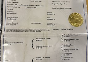 Trigger has an exceptionally smooth 4 beat gait. That requires no special shoeing to get him there, he will ride down low slow or pick up when asked, he also has a wonderful short lope that will make you just fall in love.
