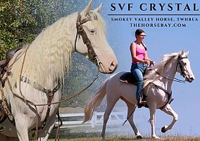 Crystal is truly one of a kind, call her a unicorn in the looks department! Standing a perfect 14.1hh and at 4 years old (coming 5 this June), this beautiful double registered Smokey Valley Horse/TWHBEA Maximum Sabino Mare is the total package.
