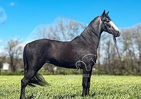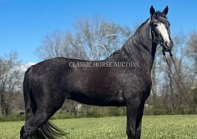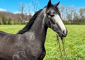Dolla’s Lilly , 3-year-old, 14.2 hand Tennessee Walking Horse filly, located in Hustonville, KY. Dolla is a versatile trail and show prospect suitable for riders looking for a young, willing partner. She is a registered filly with a striking grey color and a bold half white face, paired with a natural gait and stylish presence. She has been trail ridden extensively and confidently handles bridges, traffic, trains, wildlife, farm animals, dogs, and gunfire. Dolla rides well in a group or alone and is comfortable in the front, middle, or back. She stands for mounting and will step to a mounting block, canters off easily, and settles back down without issue. She has been started on laying down and continues to progress. On the ground, she is easy to catch, stands for routine care, and has a quiet, willing disposition.