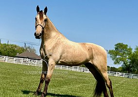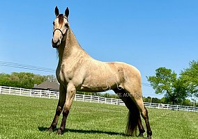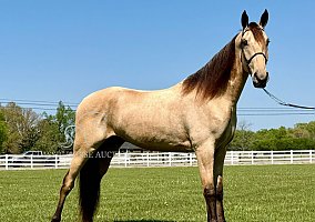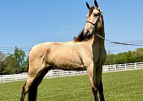 Ranger is a striking Registered Tennessee Walking Horse gelding standing 16.2 hands tall with a beautiful buckskin color and a calm, confident presence. He has spent time in Florida gaining valuable experience on a private quail hunting plantation, where he became well seasoned in dog work, gun exposure, and active hunting conditions. Do not let his height fool you. He steps right up to the mounting block and patiently waits for his rider. He has been exposed to farm life including tractors, ATVs, vehicles, and kids playing, and nothing rattles him. Ranger is as solid in the buggy as he is under saddle. He has been driven extensively and has the kind of quiet, willing attitude you want. He hooks easily, stands patiently, and drives off calm every time. He handles stop and go situations, backs with ease, and stays steady and confident whether on the road, around the farm, or in new environments. During his time in Florida, Ranger gained real world experience around dogs, gunfire, and constant activity. He learned to stay calm, focused, and dependable in high pressure environments, which adds tremendous value to his training and mindset. On the trail, Ranger continues to shine. He confidently crosses water, logs, and mud, and will stop and wait when asked. He rides out alone or with others and handles himself well in any setting. In the pasture, he gets along well with other horses, and in the barn he has excellent manners, standing quietly for baths, grooming, and the farrier. Ranger is a well rounded gelding that you can step on and enjoy. With his size, presence, driving ability, and proven plantation experience, he is ready to go to work. If you are looking for a dependable Tennessee Walking Horse with a strong foundation and real world experience, Ranger is ready to meet you. Contact us now to schedule a visit!