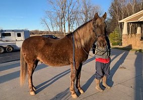 Nitro is a sweet tempered registered Rocky Mountain gelding. Chocolate with flaxen mane/tail. Smooth gaits, walk and canter. Good with farrier, loads, clips, bathes. Gets along well in pasture. Easy keeper. No grain. He is registered.