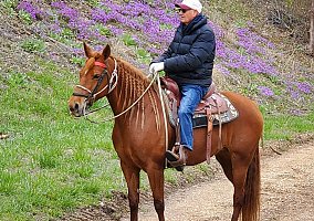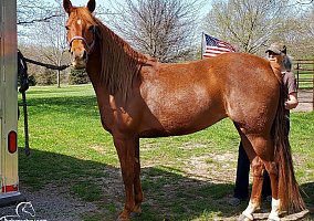 8 yr. old, registered Missouri Foxtrotter mare by the great sire Southern Sunrise and out of an Outlaws Patriot dam. Sorrel with star and 2 rear socks. Gentle, easy to catch mare than stands quietly at mounting steps for mounting and dismounting, will cross belly deep streams and rivers, easy to shoe, clip. Load and unload. Very smooth gait at 7.3 mph and average speed at walk 3.4. Great on trails and ridden mostly in Arkansas and Missouri Ozark mountains.