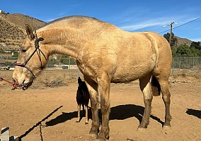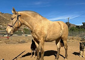 COMMENTS: Stunning imported double pearl isabelo mare, terrific bloodlines, baroque style, correct conformation, bright future for a quality color breeding mare, kind eyes, sweet temperament and breathtaking movements. She was bred on 09/04/2025 to Deseado DR (Andalusian double pearl stallion) and is confirmed for a 2026 foal. Reputable horse transportation can be arranged!