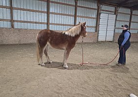 Sugar is a July 2024 Haflinger cross (unknown what the cross is) filly with a sweet, curious temperament and a solid, relationship based start. She had last year off from structured handling and has returned to training with impressive willingness and retention. She is friendly, people oriented, and showing steady improvement in emotional regulation appropriate for her age.