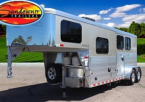 2018 Sundowner Santa Fe 6906 2-Horse Gooseneck Trailer The Santa Fe is the ultimate combination of Sundowner's most popular features and affordability. This all aluminum trailer is lightweight for towing ease and fuel economy. Please review the information provided and call our professional sales team today! EXTERIOR Tandem Axle aluminum construction Spare tire and wheel Automatic Jack LED clearance and 4 tail lights Automatic Hydraulic Jack Single Air conditioning unit Exterior step and entry grab handle and more! LIVING / BEDROOM Leather Sofa opposite of galley Storage cabinets underneath sofa Window with roller shades Double step ladder to bed Large bed with bed spread TV nightstand with stereo underneath Overhead speakers and recessed LED lights Mirrored cabinetry at headboard Windows on both sides of bed with privacy shades and more! KITCHEN / GALLEY High Pointe Microwave oven Single Bowl kitchen sink with high-neck faucet Towel Bar next to sink Solid surface granite-style countertops Dometic refrigerator under the countertop and more! BATHROOM Midship pass-through bathroom Toilet Shower Storage cabinets and more! HORSE /CARGO Two horse storage 39" stall width Complete Aluminum construction Air flow dividers with pads Pop-up vent per horse stall Dome light in horse area Collapsible rear tack with saddle rack, tack hooks and light and more! MSRP $40,437 Sale $34,371